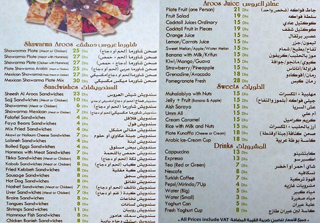 قائمة اسعار مطعم عروس دمشق بالامارات 2025